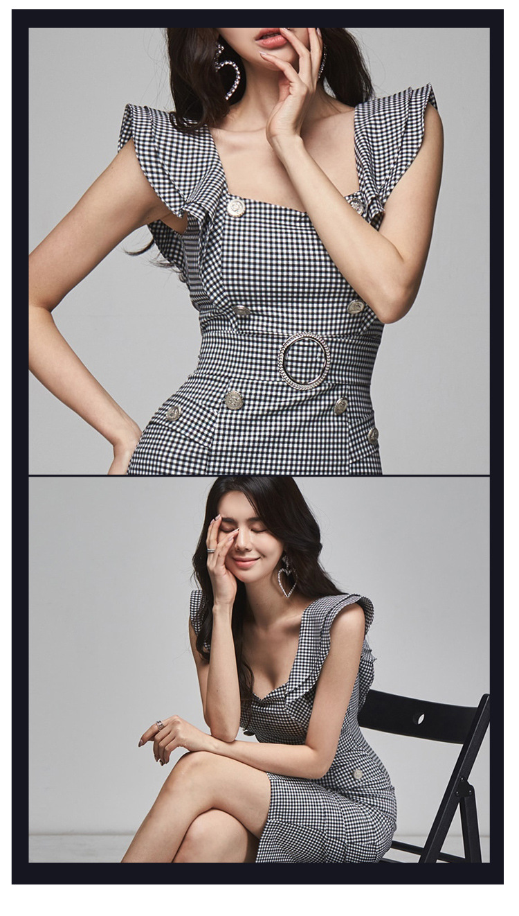 New Ladies Fashion Houndstooth Dress With Waist And Hip Slits