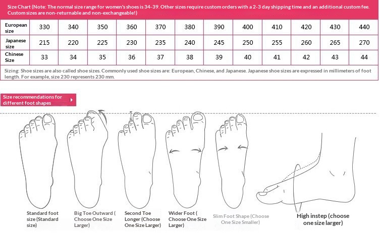 Sizes: 34, 35, 36, 37, 38, 39, 40 — Custom orders are non-returnable and non-exchangeable; 41 — Custom orders are non-returnable and non-exchangeable; 42 — Custom orders are non-returnable and non-exchangeable; 43 — Custom orders are non-returnable and non-exchangeable; 44 — Custom orders are non-returnable and non-exchangeable; 45 — Custom orders are non-returnable and non-exchangeable; 46 — Custom orders are non-returnable and non-exchangeable; 47 — Custom orders are non-returnable and non-exchangeable; 48 — Custom orders are non-returnable and non-exchangeable